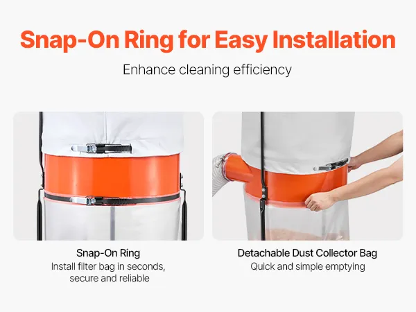 Moeiteloze toegang tot de stofzak: het clipontwerp van onze houtstofzuiger maakt onderhoud moeiteloos. Maak de clips eenvoudig los om de stofzak te verwijderen of te legen en verwijder snel zaagsel en vuil. Dit eenvoudige systeem vermindert de uitvaltijd en zorgt voor een soepel verloop van uw houtbewerkingsprojecten.