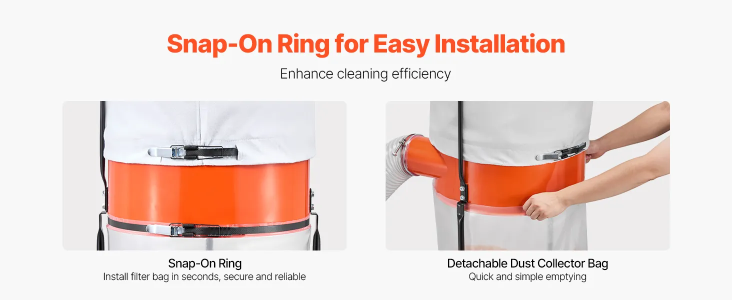 Uitgerust met een clip-on filter en stofzakken, zorgt dit stofafzuigsysteem voor een snelle installatie en veilige bevestiging. De stofzak kan worden verwijderd en eenvoudig worden geleegd. Dit zorgt voor een schone, efficiënte stofafvoer en bespaart kostbare tijd bij het werken met hout.
