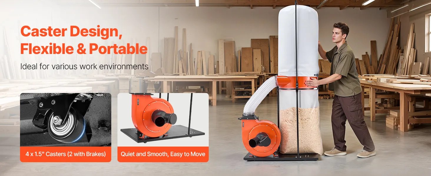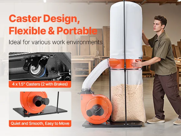 Uitgerust met vier wendbare wielen is onze houtstofzuiger gemakkelijk te verplaatsen in diverse werkplaatsen. Hij kan moeiteloos overal worden geplaatst, wat zorgt voor een soepele werking en de efficiëntie van stofafzuigwerkzaamheden in uiteenlopende omgevingen verhoogt.