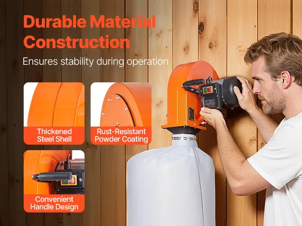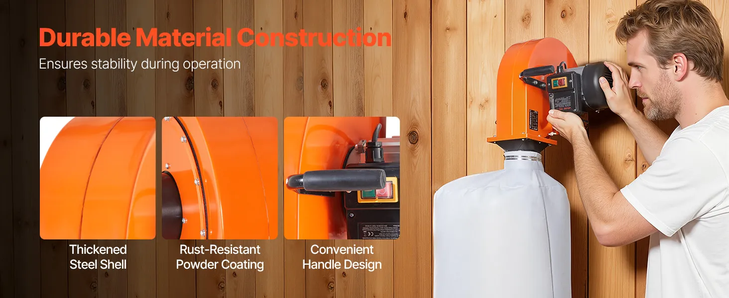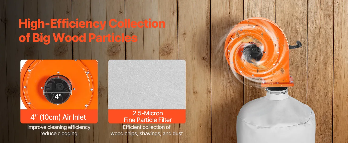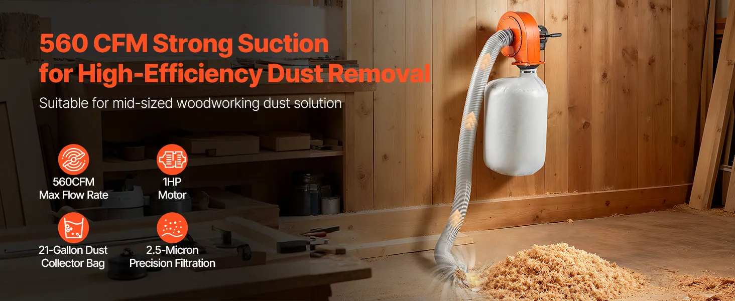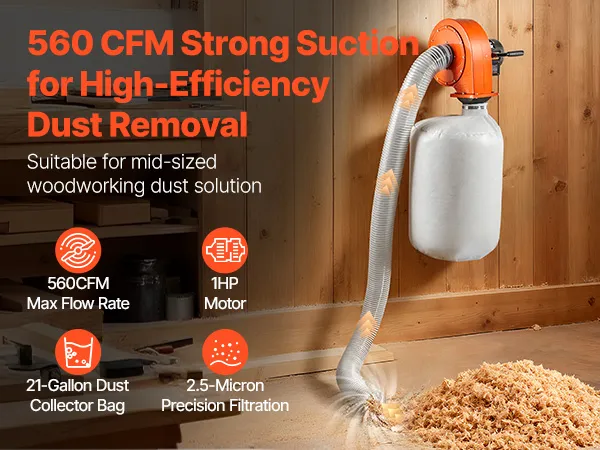 Hoogwaardige stofafzuiging: Met een luchtstroom van 951,45 m³/u (560 CFM) biedt dit stofafzuigsysteem voor houtbewerking een stabiele en krachtige afzuiging. Het verwijdert snel zowel grof zaagsel als fijn schuurstof, wat zorgt voor een schone werkplaats, minder schoonmaaktijd en efficiëntere houtbewerking.