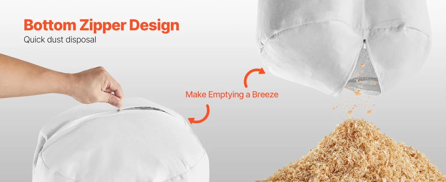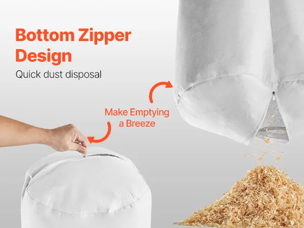 Eenvoudige stofverwijdering: onze wandstofzuiger is voorzien van een fleecezak met een handige rits aan de onderkant voor snelle en gemakkelijke verwijdering van vuil. U hoeft de zak niet te verwijderen of extra gereedschap te gebruiken – rits hem gewoon open om het zaagsel en de opgevangen deeltjes te legen. Dit vereenvoudigt het onderhoud en bespaart kostbare tijd.