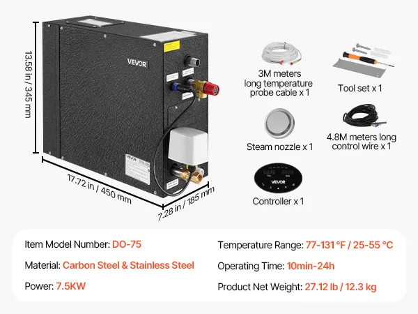 Geschikt voor veel ruimtes: De stoomgenerator van 7,5 kW is geschikt voor stoomdouches, thuissauna's en badkamers met een inhoud van 5-7,5 m³. Door zijn compacte formaat is hij geschikt voor installatie onder wastafels of in kasten, waardoor hij ideaal is voor krappe ruimtes en aangepaste configuraties.