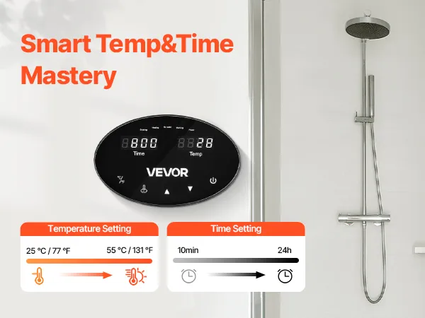 Intelligente temperatuur- en timerregeling: Met de digitale regeling kunt u eenvoudig de temperatuur (25-55 °C) en de tijd (10-24 uur) aanpassen. Realtime-indicatoren voor verwarming, watertekort en afvoer geven u volledige controle over uw stoomdouchesysteem.
