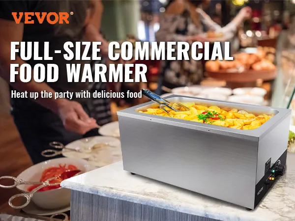 Nat of droog gebruiken: onze commerciële voedselverwarmer heeft een waterpan met een capaciteit van 24 qt / 26,4 L (afmetingen: 13,9 x 21,9 x 6,5 inch/ 555 x 355 x 260 mm) die zowel nat als droog kan worden gebruikt. U kunt voedsel direct in de pan verwarmen of de pan gebruiken voor een standaard stomer van volledige grootte, twee 1/2 "of drie 1/3" stoomkokers (pannen niet inbegrepen) om groenten, hotdogs, eieren te koken, spek te bewaren en andere warme en smakelijke gerechten voor uw gasten.
