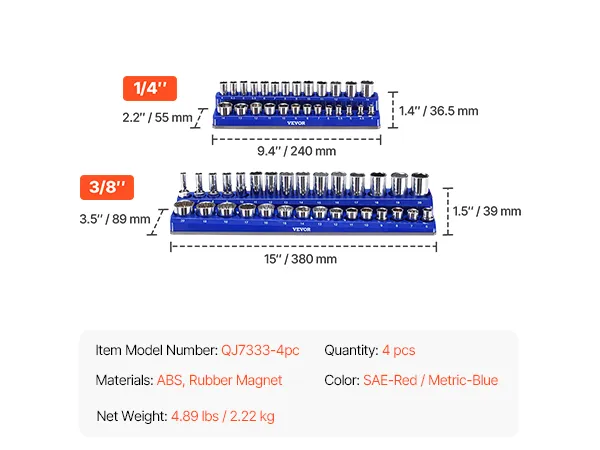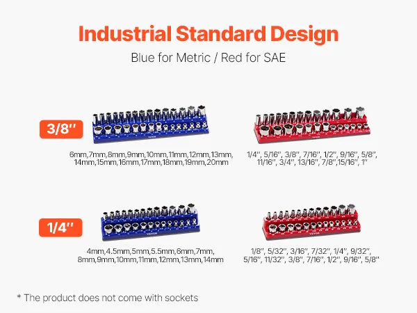 Professional Design: Our socket organizer holders feature 2 colors: blue for metric and red for SAE. The set includes 108 slots, suitable for SAE sizes from 1/8" to 5/8" (1/4" drive) and 1/4" to 1" (3/8" drive) ; metric sizes from 4 to 14mm (1/4" drive) and 6 to 20mm (3/8" drive).