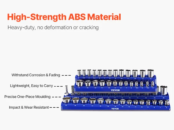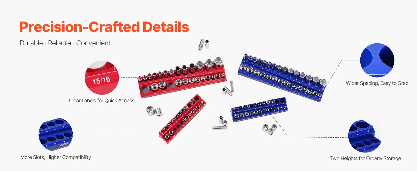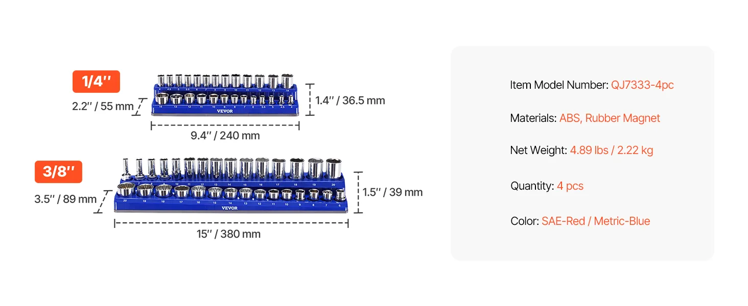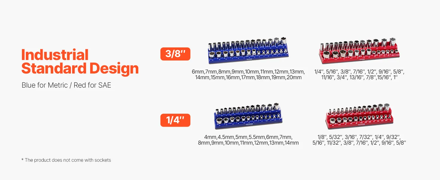 High Compatibility: Designed to be compatible with multiple socket brands, VEVOR 4PCS magnetic socket organizer set holds up to 108pcs metric and SAE standard & deep sockets., simplifying sockets management, keeping the workspace clean and ensuring you won't lose any sockets. Note: Sockets are not included.