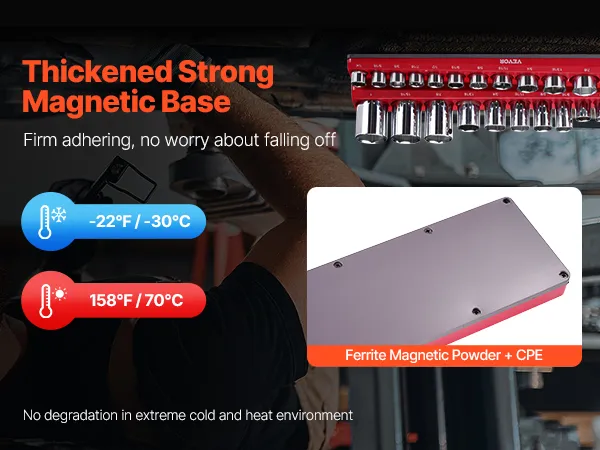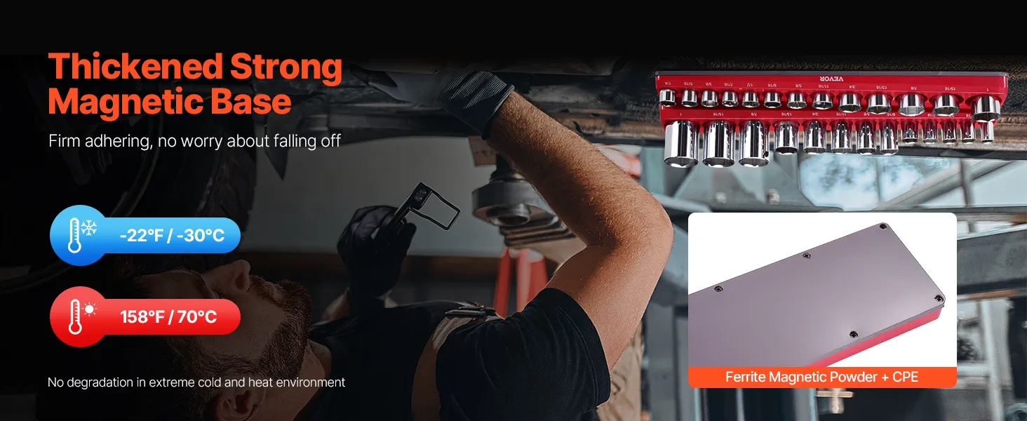 Strong Magnetic Base: Featuring a robust 5mm thick magnetic base composed of ferrite and CPE, our socket organizers for toolbox provides strong, stable attachment to metal surfaces, keeping sockets trays firmly in place without slipping.