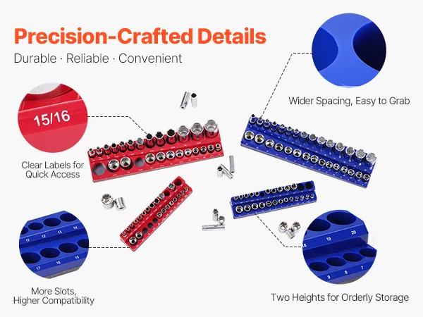 VEVOR magnetic socket organizer set is compatible with many socket brands, streamlining storage and keeping tools handy. Its strong magnetic base grips firmly on many metal surfaces, creating a quick workspace. Ideal for various scenarios, it keeps sockets organized and accessible, saving effort.