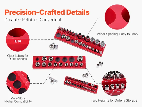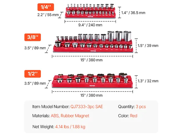 Professional Design: Crafted to meet industry standards, our red socket organizers are specifically designed for SAE sockets (1/4", 3/8", and 1/2" drive). These magnetic socket holders simplify organization, allowing you to quickly locate the right socket when needed, enhancing your work efficiency.