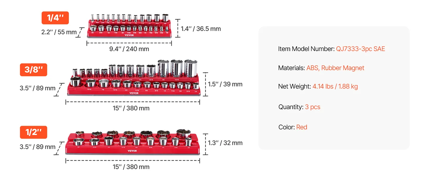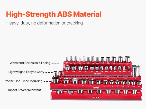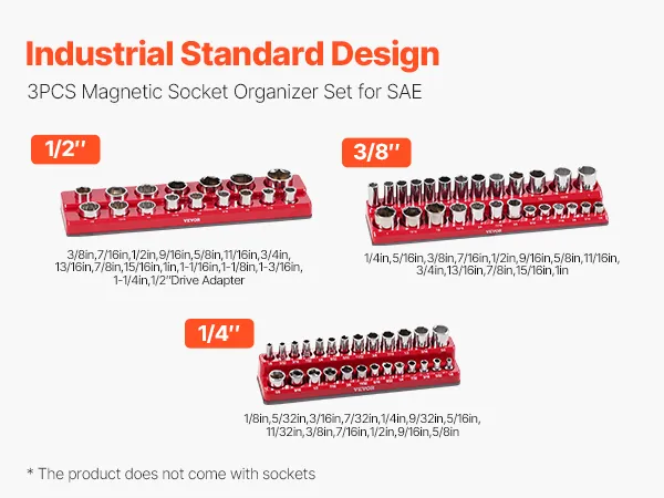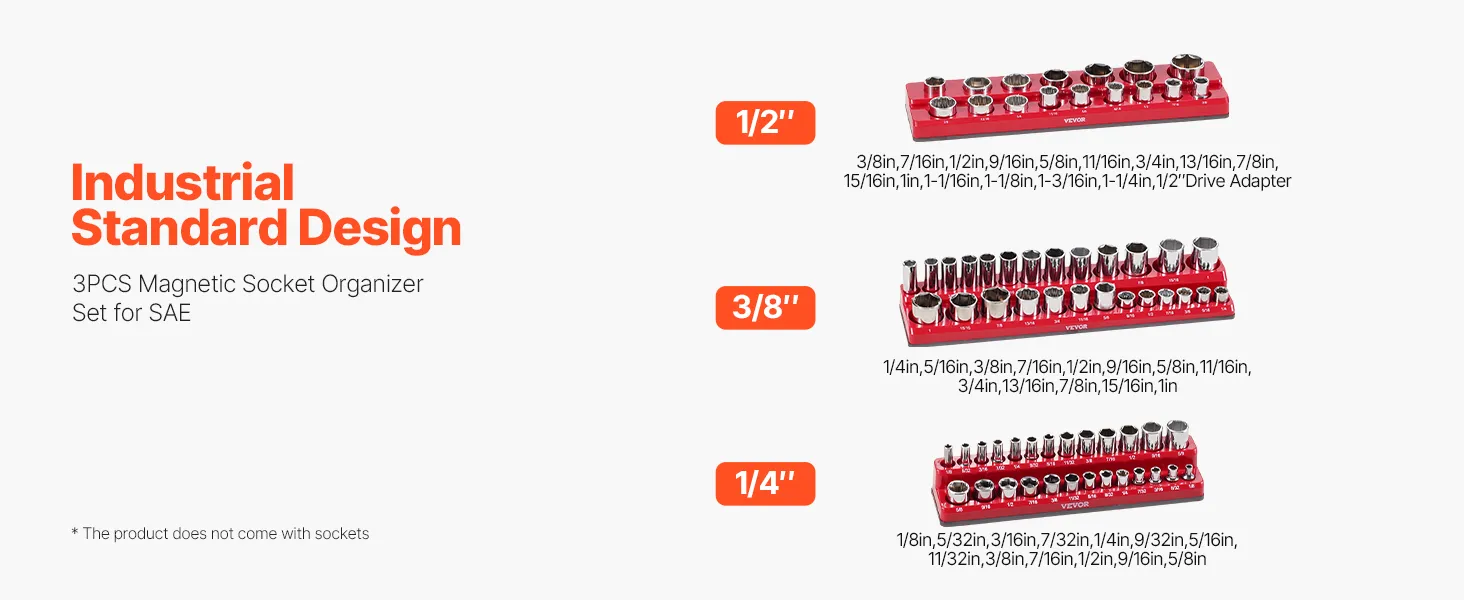 High Compatibility: Designed to be compatible with multiple socket brands, VEVOR 3PCS magnetic socket organizer set holds up to 68pcs SAE standard and deep sockets, simplifying sockets management, keeping the workspace clean and ensuring you won't lose any sockets. Note: Sockets are not included.