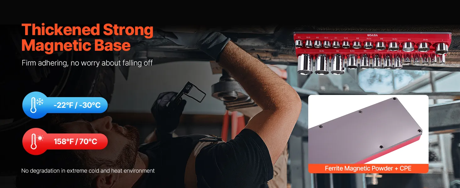 Strong Magnetic Base: Featuring a robust 5mm thick magnetic base composed of ferrite and CPE, our socket organizers for toolbox provides strong, stable attachment to metal surfaces, keeping sockets trays firmly in place without slipping.