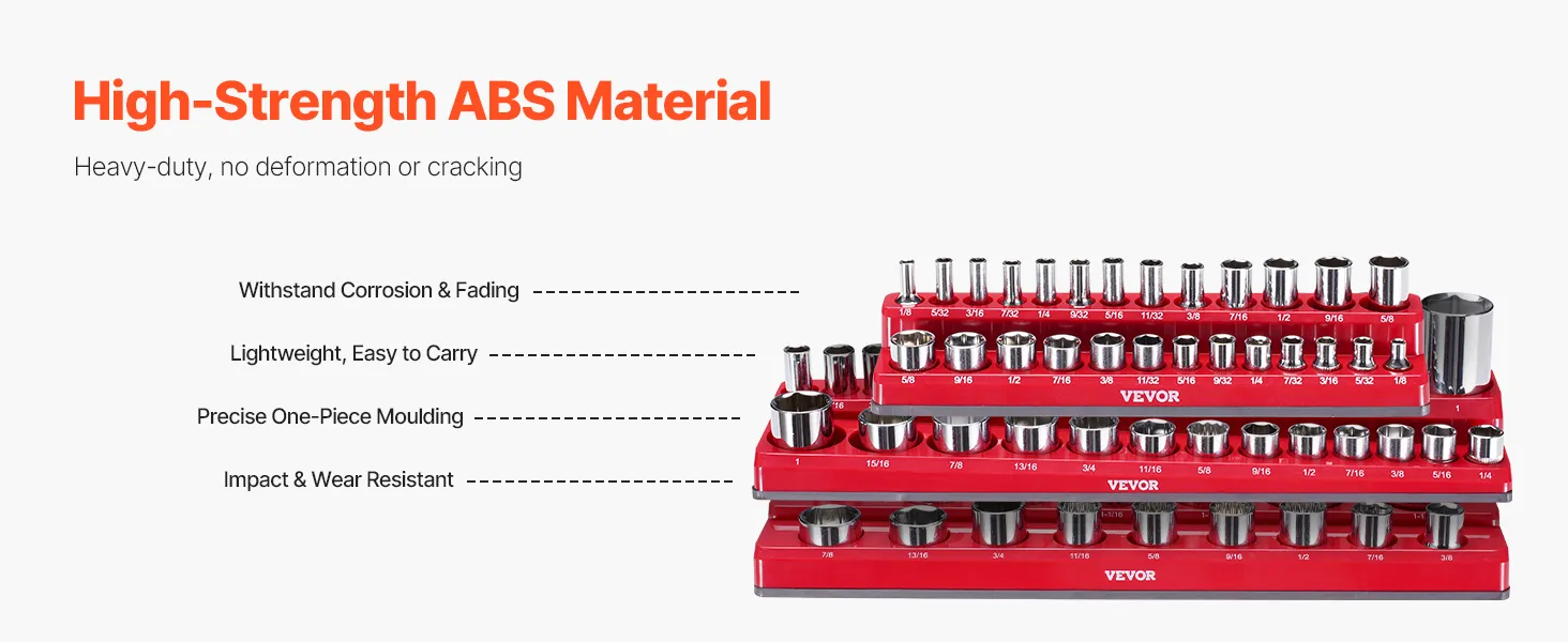 Built to Last: Made from reinforced ABS material, our socket organizer tray resists impact and wear. The clear size labels won’t fade over time, ensuring long-lasting convenience.