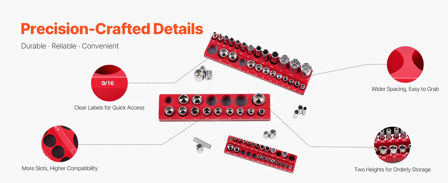 VEVOR magnetic socket organizer set is compatible with many socket brands, streamlining storage and keeping tools handy. Its strong magnetic base grips firmly on many metal surfaces, creating a quick workspace. Ideal for various scenarios, it keeps sockets organized and accessible, saving effort.