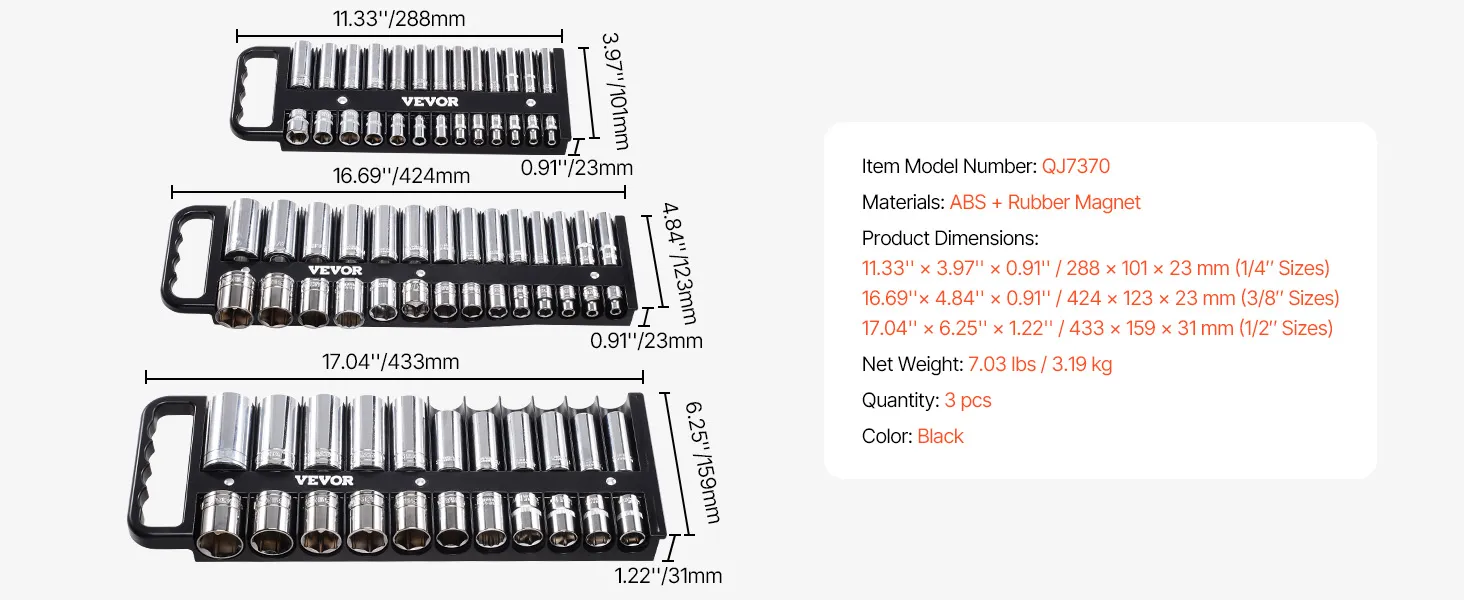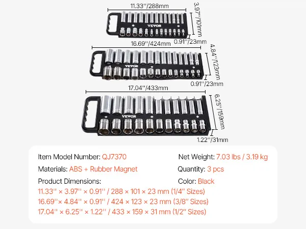 High Compatibility: VEVOR 3PCS portable socket organizer set is compatible with various socket brands, equipped with 26 clips for 1/4" drive, 28 clips for 3/8" drive, and 28 clips for 1/2" drive, accommodating a total of 76PCS metric & SAE sockets. Flexible storage and portability make your socket organization convenient for on-the-go work. Note: Sockets are not included.