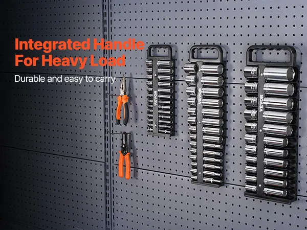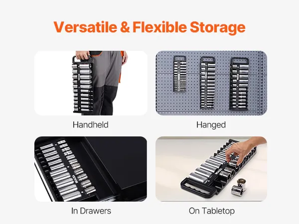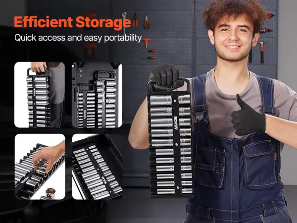 Ergonomic Handle: The comfortable handle on this portable socket organizer kit makes it easily portable, whether heading to a job site or workshop. Use it the way you need—either carry it by hand or hang it for convenience.