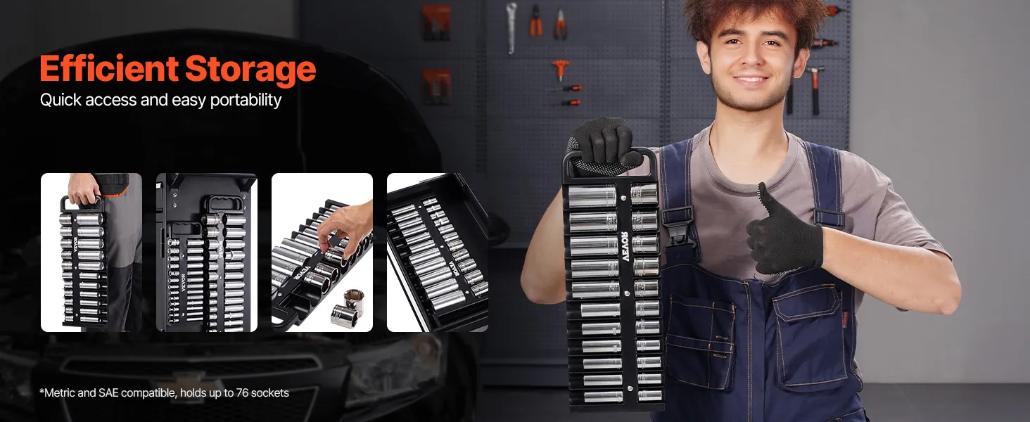 This portable organizer kit accommodates 76pcs sockets of 1/4'', 3/8'' and 1/2'' sizes for metric and SAE, with adjustable spacing to keep everything neatly organized and easy to manage.