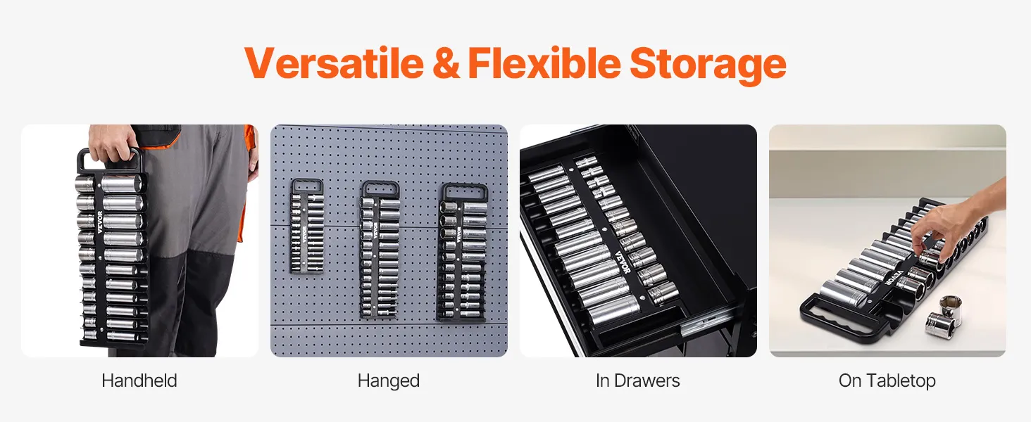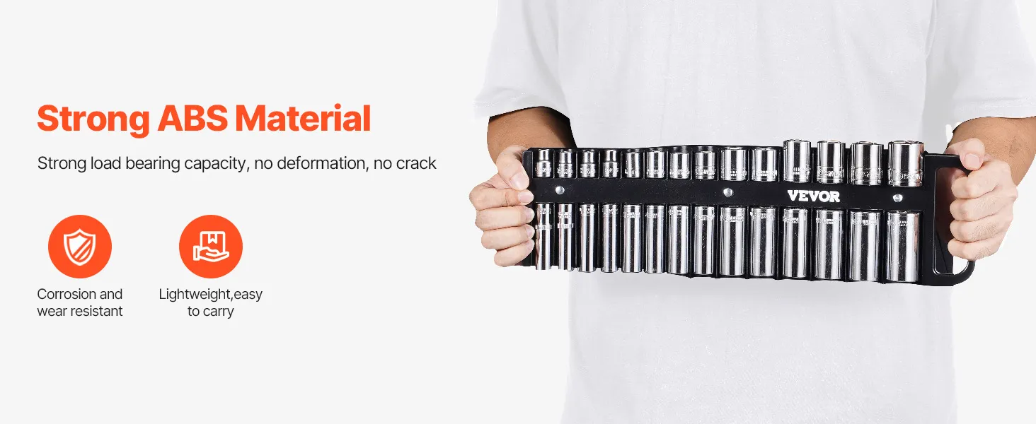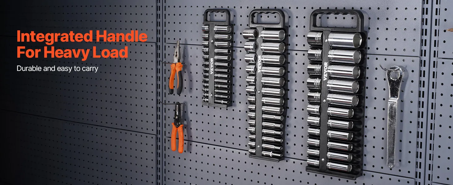 VEVOR portable socket organizer tray keeps sockets secure with its magnetic base. This socket tray features an ergonomic handle for convenience and is compatible with many socket brands. Made from sturdy ABS, this strong socket holder streamlines storage and boosts efficiency in various scenarios.