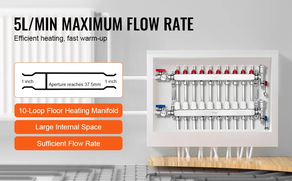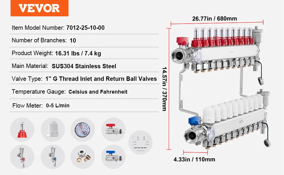 Productspecificaties: Deze vloerverwarmingsverdeler is voorzien van 10 aftakkingen, kogelkranen met G-schroefdraad van 1 inch/2,54 cm voor aanvoer en retour en ondersteunt een debiet tot 5 l/min. Inclusief een adapter van 1/2 inch/1,27 cm en twee temperatuurmeters (voor weergave in Fahrenheit en Celsius), waardoor het een ideale keuze is voor efficiënte vloerverwarmingssystemen.