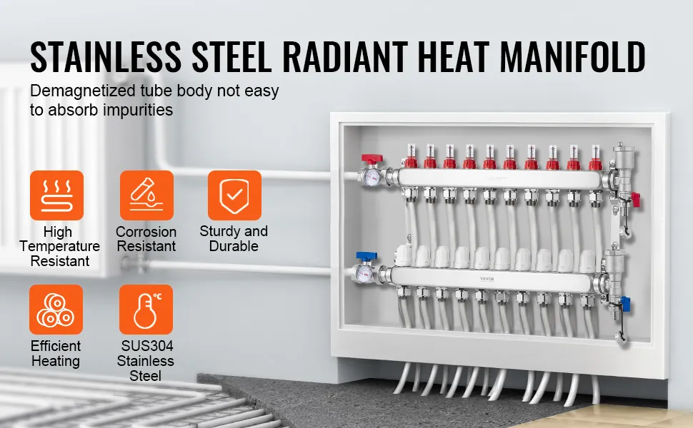 Duurzaam: De VEVOR verwarmingsverdeler is gemaakt van duurzaam roestvrij staal 304 en is bestand tegen hoge temperaturen, corrosie en druk. Hij behoudt zijn vorm en integriteit bij langdurig gebruik en biedt een hogere thermische geleidbaarheid, snellere verwarmingssnelheden en snellere plaatsing van kunststof leidingen.