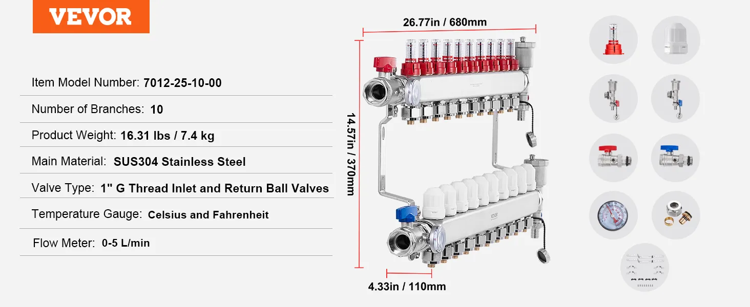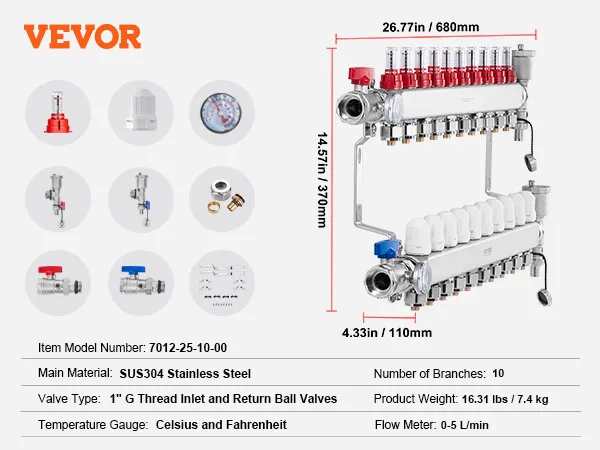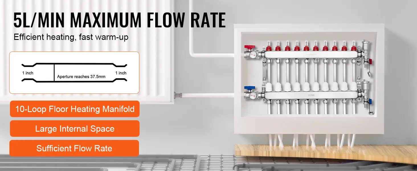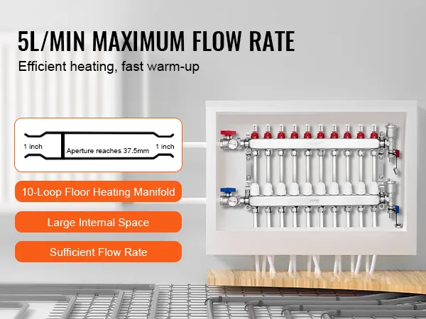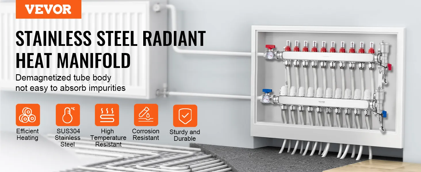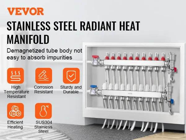 Choose VEVOR 10-branch radiant heat manifold for fast and reliable heating. With a flow rate of up to 5L/min, it provides rapid and consistent warmth throughout space. SUS304 stainless steel structure offers exceptional high-temperature and corrosion resistance, ensuring long-lasting performance.