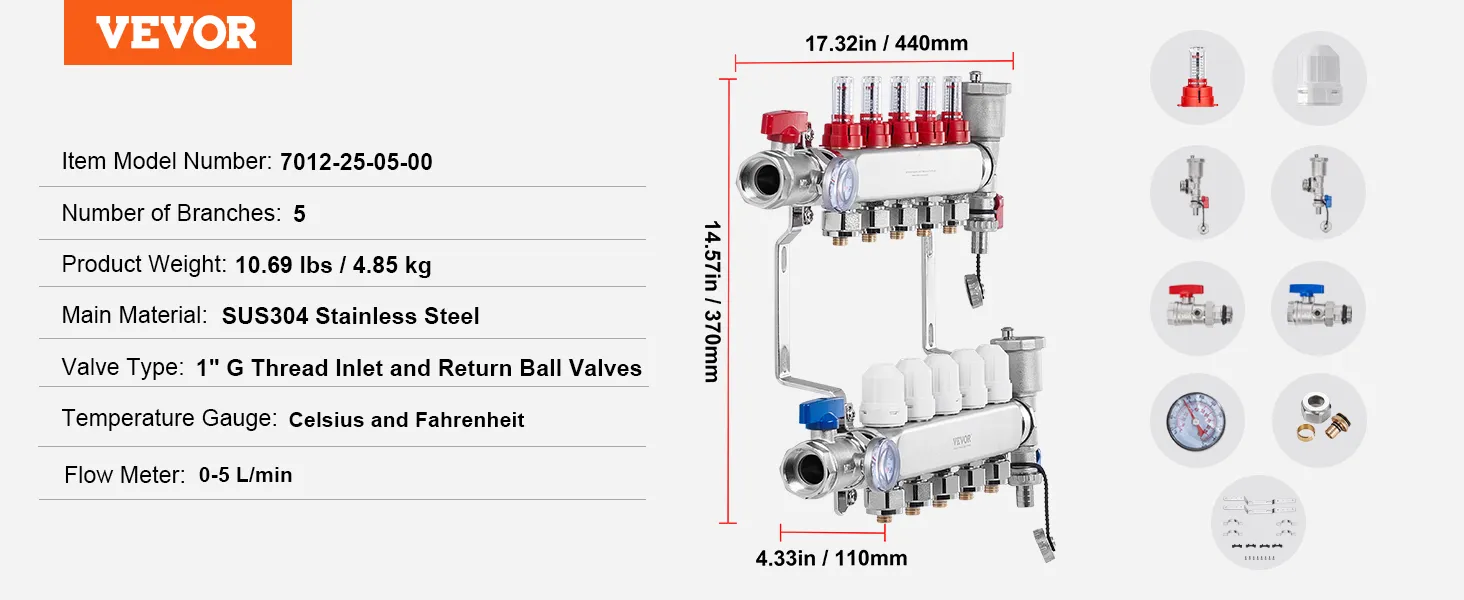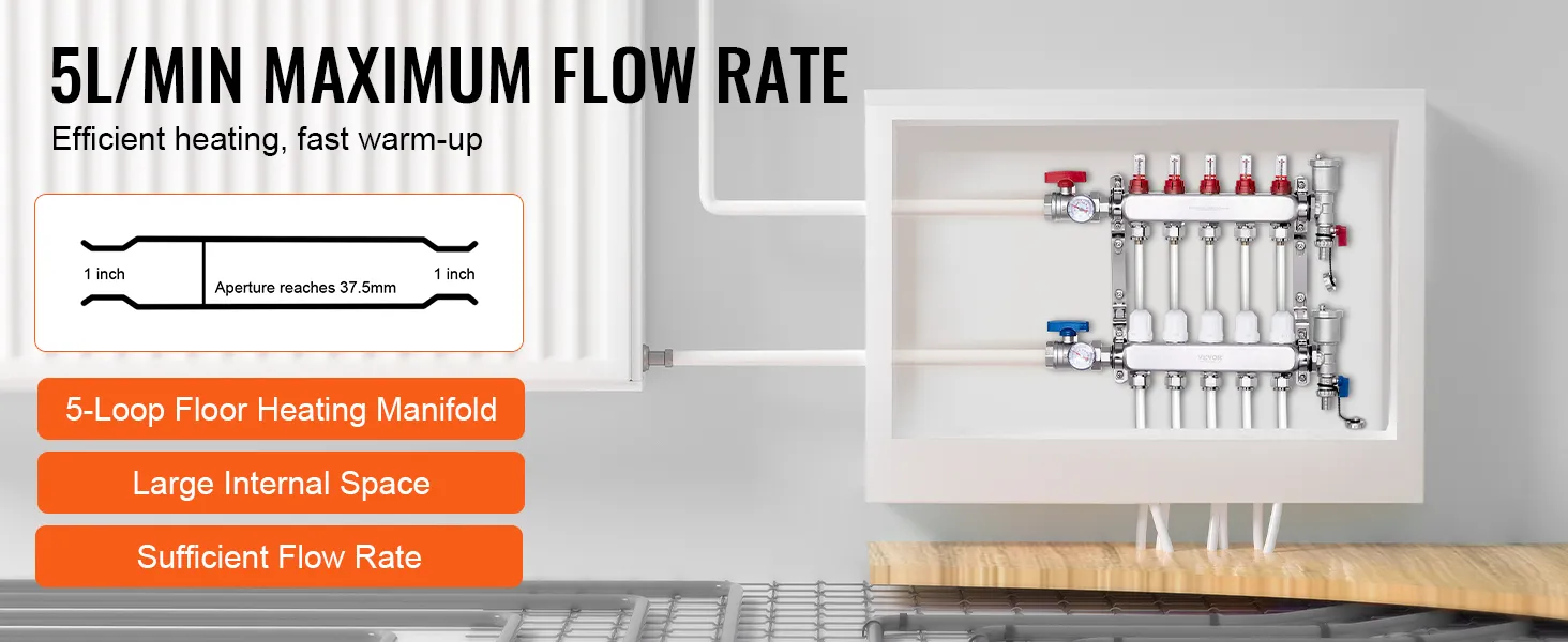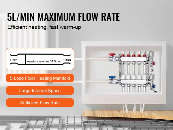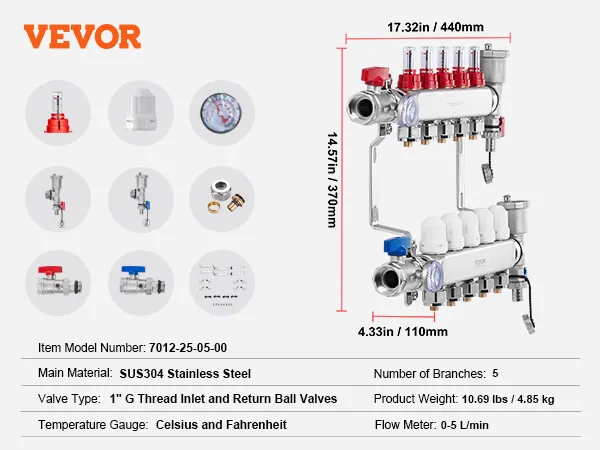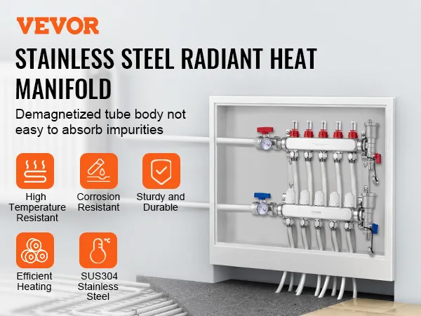 Choose VEVOR 5-branch radiant heat manifold for fast and reliable heating. With a flow rate of up to 5L/min, it provides rapid and consistent warmth throughout space. SUS304 stainless steel structure offers exceptional high-temperature and corrosion resistance, ensuring long-lasting performance.