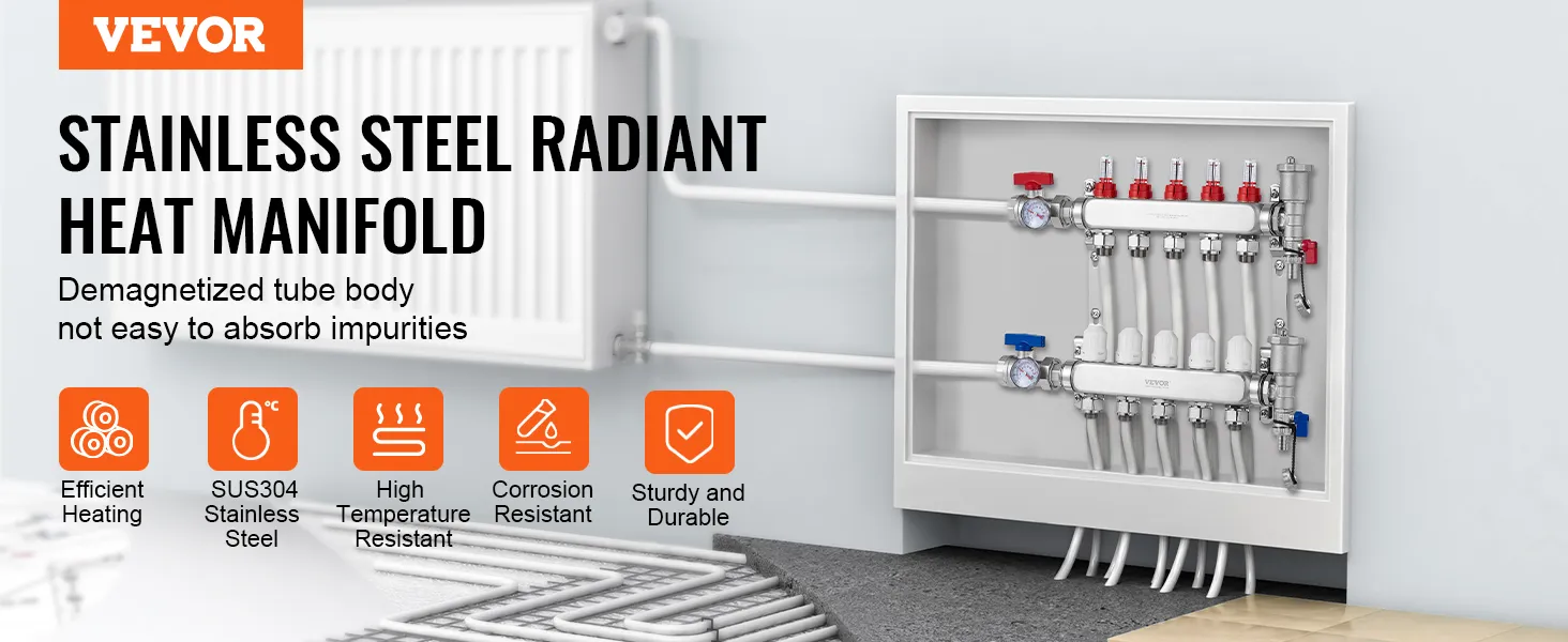 Built to Last: VEVOR pex tubing manifold is made from durable 304 stainless steel, resistant to high temperatures, corrosion, and pressure. It maintains its shape and integrity over long-term use, offering higher thermal conductivity, faster heating speeds, and quicker insertion of plastic pipes.