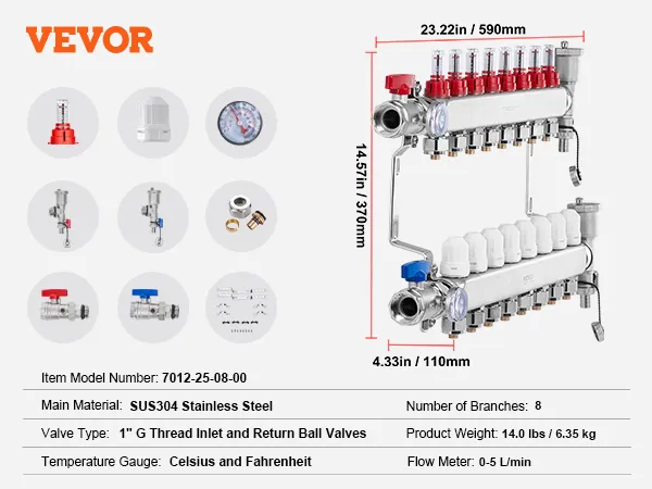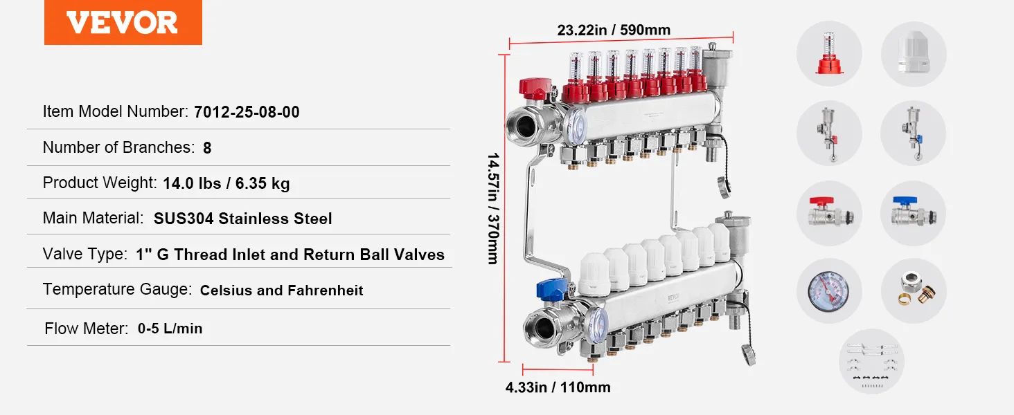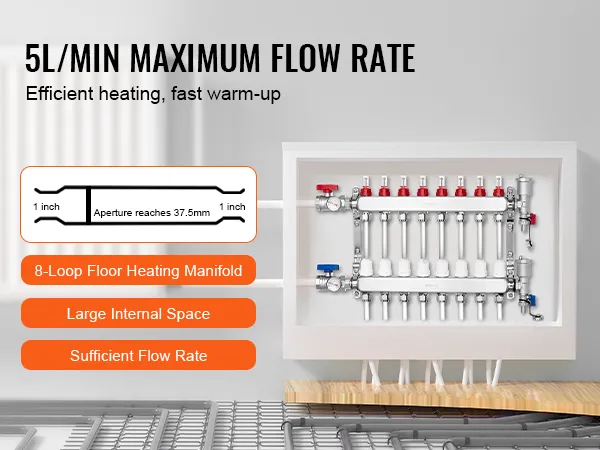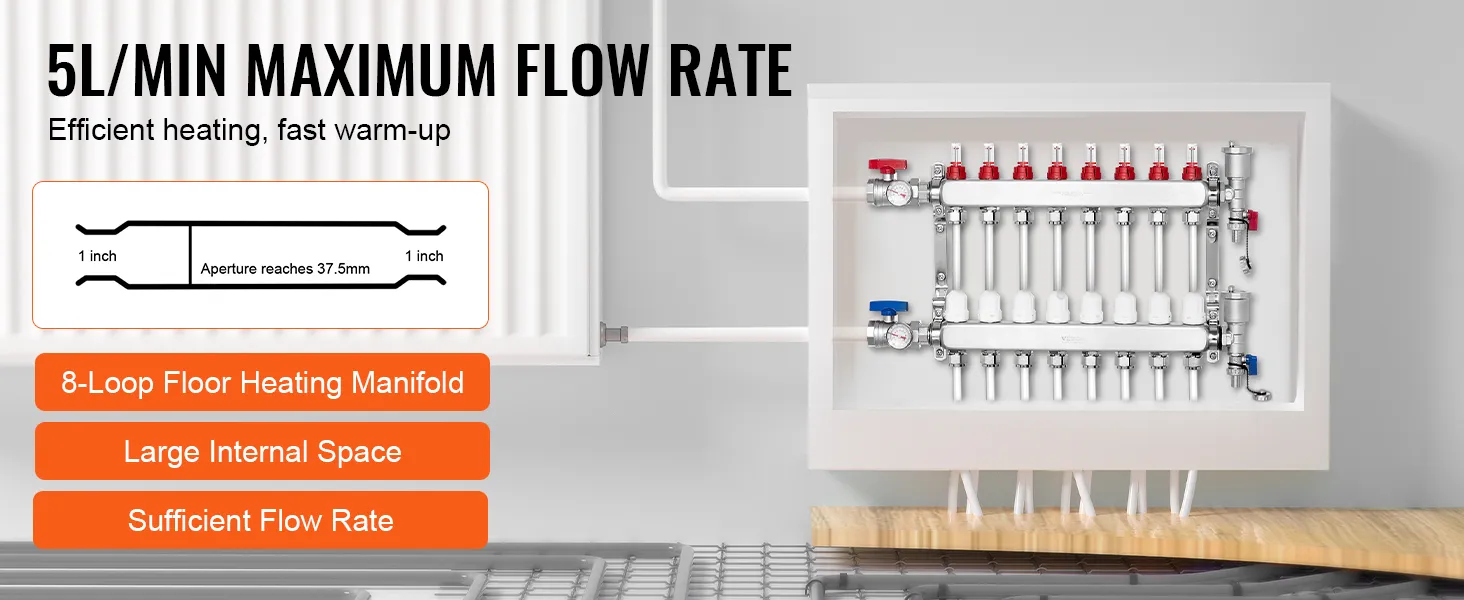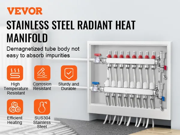 Choose VEVOR 8-branch radiant heat manifold for fast and reliable heating. With a flow rate of up to 5L/min, it provides rapid and consistent warmth throughout space. SUS304 stainless steel structure offers exceptional high-temperature and corrosion resistance, ensuring long-lasting performance.