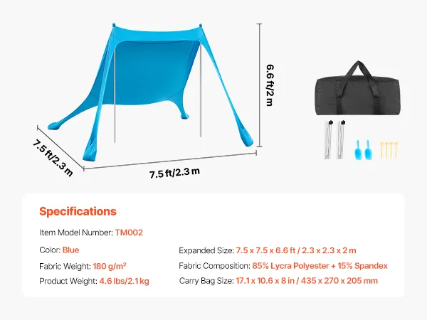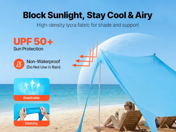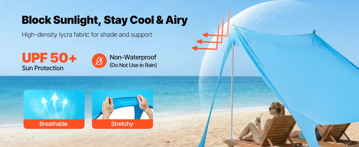 Deze strandtent, gemaakt van een hybride Lycra-stof, biedt UV-bescherming van 50+ en beschermt tegen zonnebrand tijdens buitenactiviteiten. De dichte weefstructuur en hoge elasticiteit verbeteren de scheurweerstand, wat zorgt voor een lange levensduur en optimale bescherming tegen de zon en wisselende weersomstandigheden.