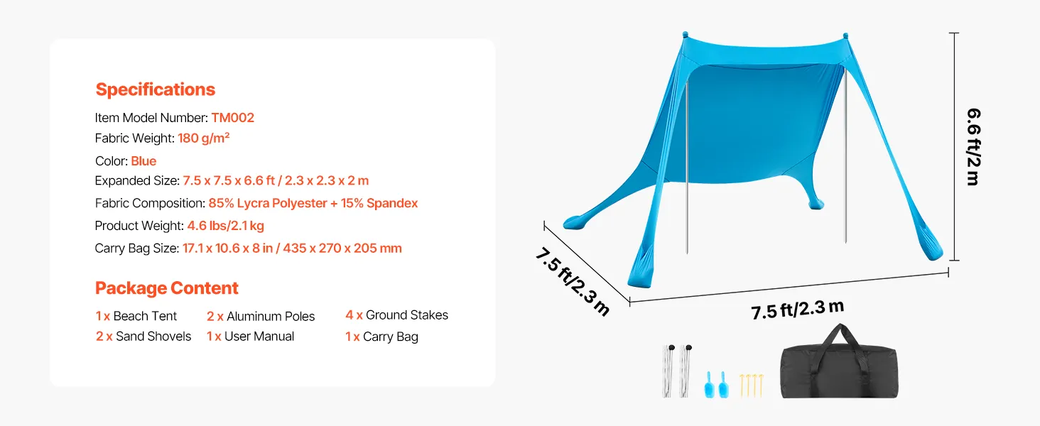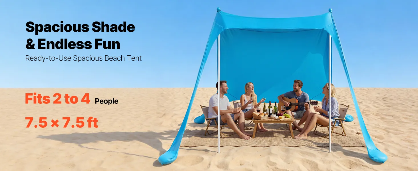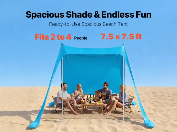 • Ruime schaduwplek: Deze strandtent biedt een grote schaduwplek van 2,3 x 2,3 x 2 meter, ideaal voor gezinnen of groepen van 2 tot 4 personen. Dankzij de meegeleverde zandzakken en zandschep is de tent snel en eenvoudig op het strand op te zetten.