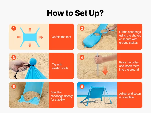• Geschikt voor elk terrein: dankzij de verankering met zandzakken of haringen kan deze strandtent stevig worden opgezet op zand, gras en andere ondergronden. De zandzakken of stokken kunnen eenvoudig worden verplaatst om de schaduwhoek aan te passen aan de stand van de zon.