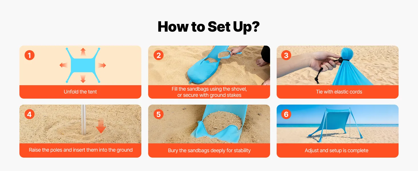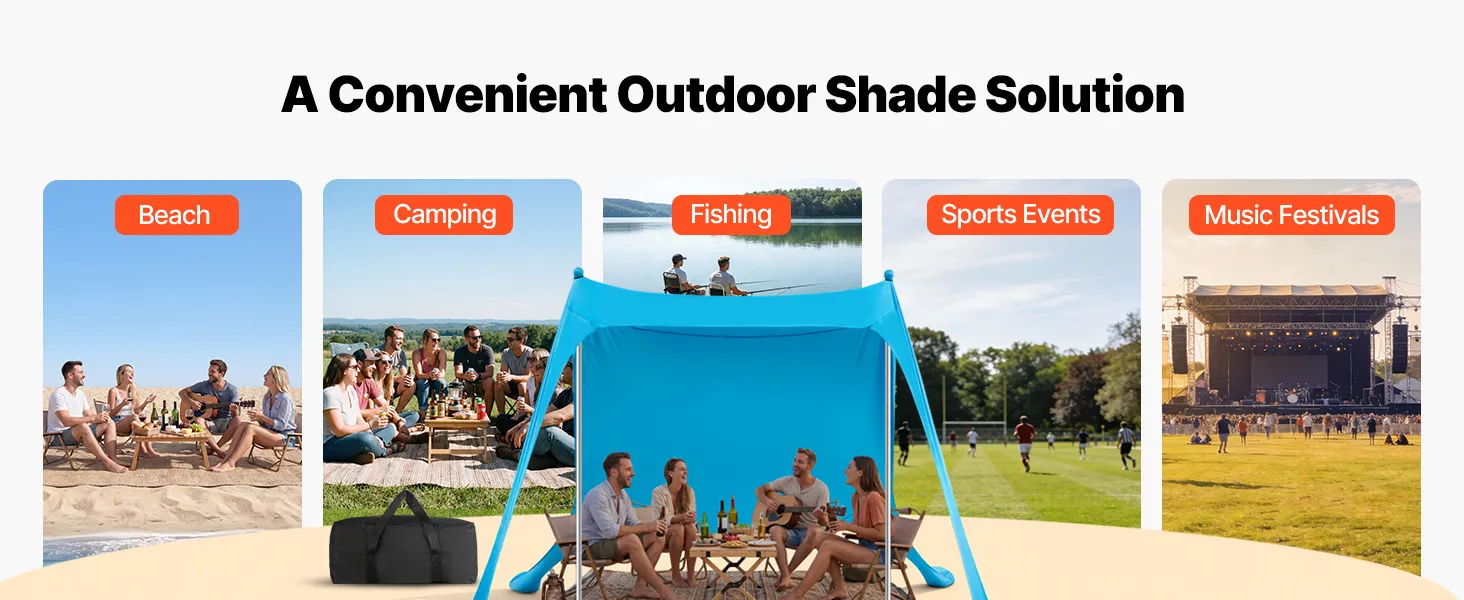 Deze draagbare strandtent biedt betrouwbare schaduw en ontspanning – ideaal voor stranddagen, tuinfeesten, picknicks in het park of kampeertrips – zodat u zelfs bij fel zonlicht koel en beschermd blijft.
