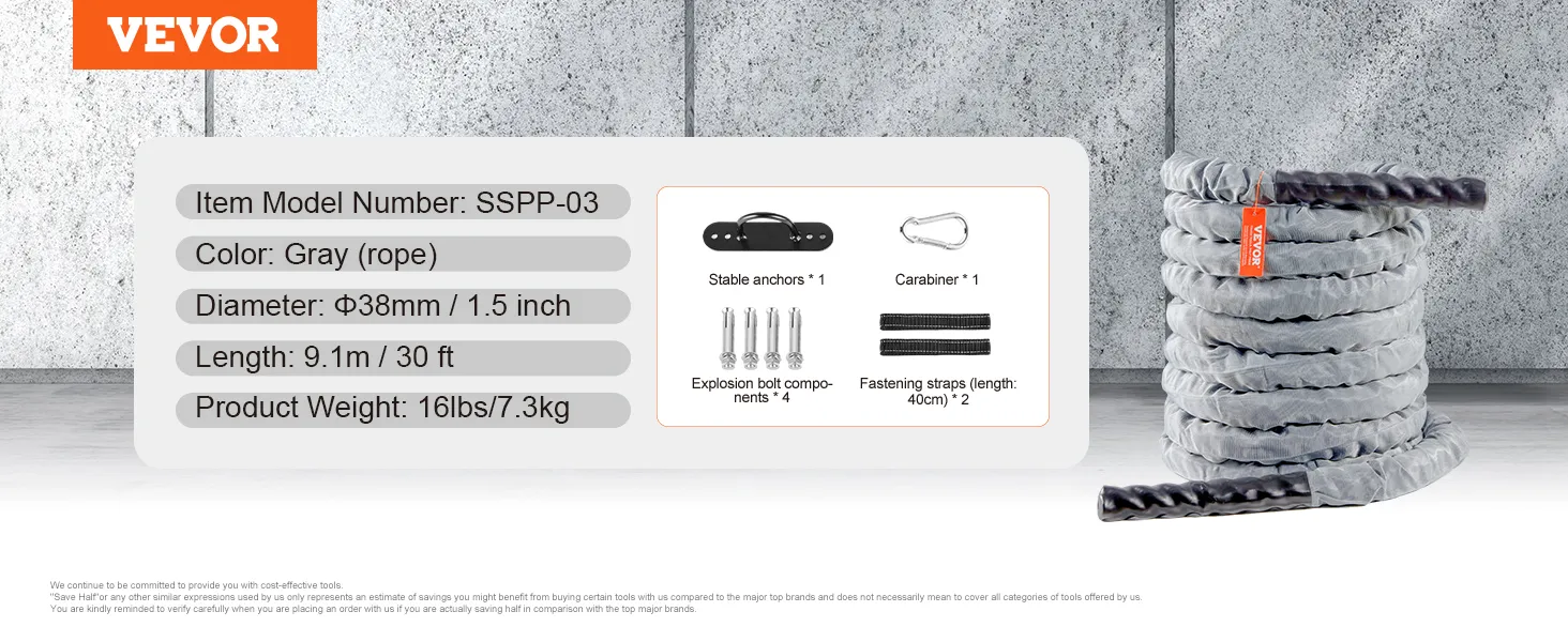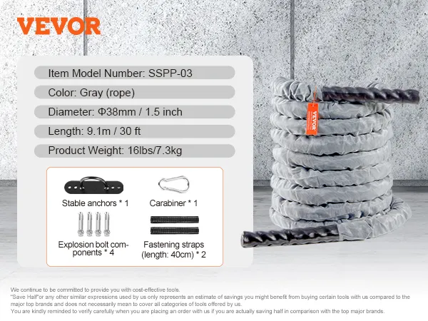 Het VEVOR fitness touw is het perfecte hulpmiddel voor krachttraining. Het kan worden gebruikt voor verschillende oefeningen, wat de algehele conditie verbetert. Het ontwerp van het touw ondersteunt trekken, klimmen en op-en-neer bewegingen. Dit maakt het een compleet hulpmiddel in fitnessregimes. Het is vooral effectief voor het verbeteren van de cardiovasculaire gezondheid. Vanwege de draagbaarheid en het gebruiksgemak is het ongelooflijk nuttig. U kunt het thuis, in de sportschool of buiten gebruiken om fitnessdoelen te bereiken. Ons touw helpt spierkracht en uithoudingsvermogen op te bouwen. Dit touw is dus zeer effectief voor verschillende trainingsroutines, of u nu thuis bent of in een professionele sportschool.