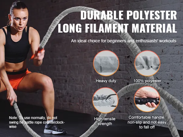 Dit is het 1,5-inch battle rope gemaakt van hoogwaardige materialen. Het heeft drie strengen van 100% polyester voor verbeterde duurzaamheid. Het touw is bestand tegen losraken en vervorming. Bovendien voegt de nylon beschermhoes een extra beschermingslaag toe. Dit zorgt ervoor dat u in topconditie blijft voor langdurig gebruik. De compacte structuur van ons touw biedt een sterke treksterkte. Het is dus een betrouwbaar hulpmiddel voor intensieve trainingen. Met zijn robuuste constructie zorgt het gemakkelijk voor langdurige duurzaamheid bij intensief gebruik.