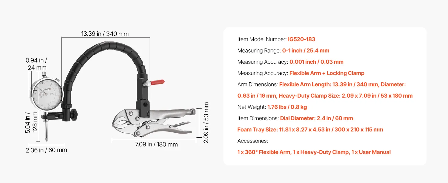 VEVOR-meetklok met 360° flexibele arm en 360°-griptang, nauwkeurigheid 0,03 mm, bereik 0-25,4 mm, professioneel voor het instellen van machines, meten van krappe ruimtes, opbergkoffer