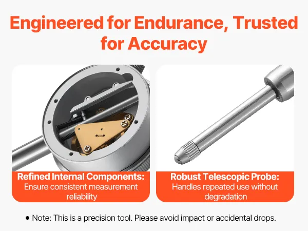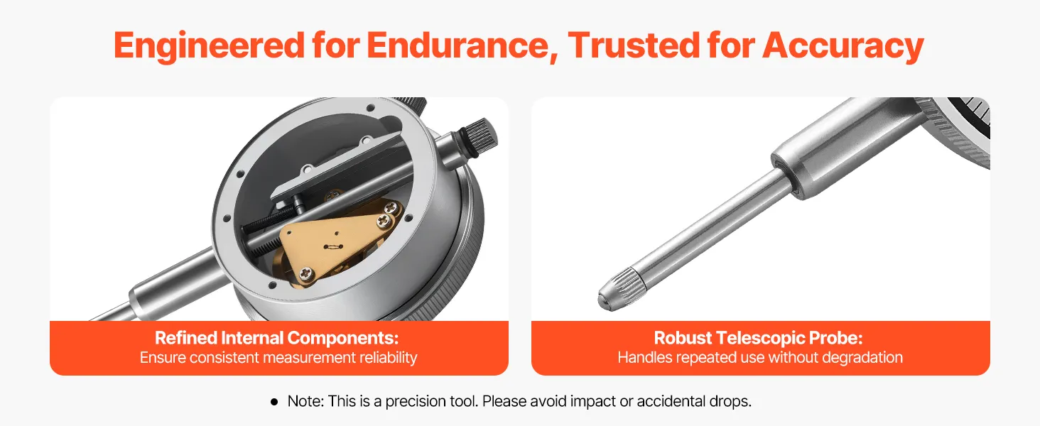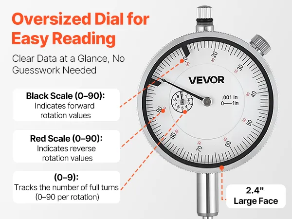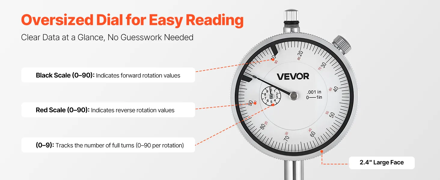 Duidelijke aflezingen: Dankzij de contrastrijke wijzerplaat van 60 mm (2,4 inch) zijn deze meetklokken gemakkelijk af te lezen, zelfs bij weinig licht of met handschoenen aan. De fijne schaalverdeling maakt nauwkeurige metingen mogelijk tijdens herhaalde inspecties.