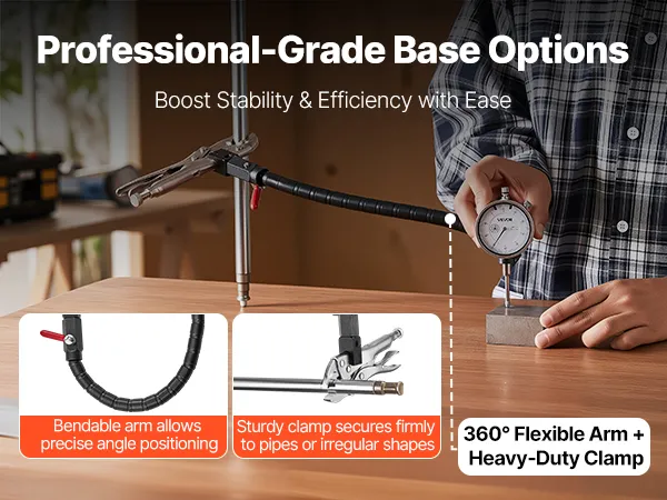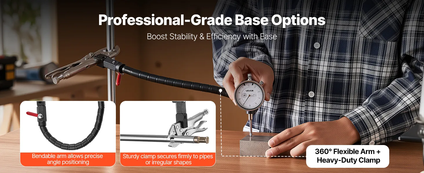 360 graden flexibele arm: De flexibele standaard maakt verstelling in elke hoek mogelijk, terwijl de griptang kan worden bevestigd aan buizen, frames of niet-metalen oppervlakken. In combinatie met een meetklok is hij geschikt voor metingen in krappe ruimtes en op onregelmatige werkstukken.
