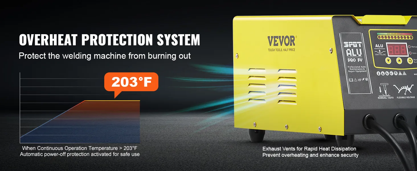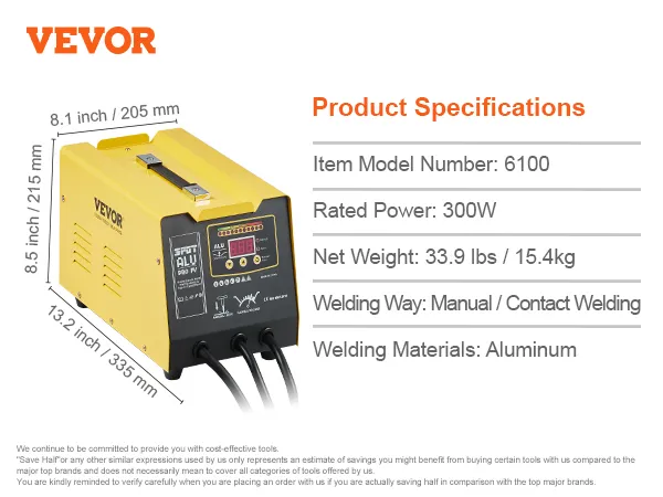 Met een vermogen van 300 W, automatische/handmatige lasmodi en lastechnologie met condensatorenergieopslag biedt de VEVOR deukverwijderaar een complete oplossing. Hij biedt een snelle oplossing voor het verwijderen van deuken uit aluminium carrosseriepanelen.
