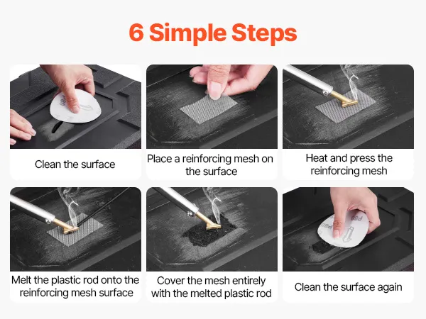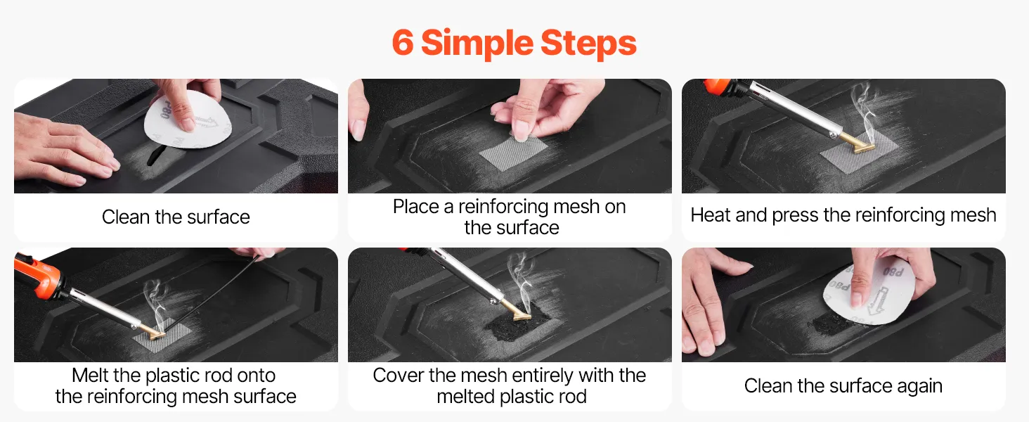 Betrouwbare kunststofreparaties in 6 eenvoudige stappen: van oppervlaktevoorbereiding tot het smelten van de staaf, elke stap is eenvoudig en gemakkelijk onder de knie te krijgen. (Er kan rook ontstaan bij de eerste passage vanwege de flux op de punt; dit is normaal. Gebruik in een goed geventileerde ruimte en draag een masker.)