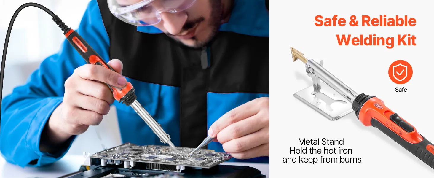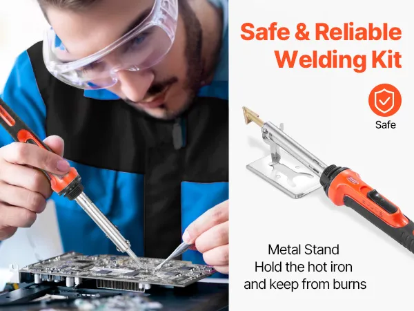 Onze soldeerboutreparatieset voor kunststof bevat een stevige metalen standaard waarop u uw gloeiendhete soldeerbout kunt plaatsen en deze kunt beschermen tegen onbedoelde brandwonden. Dit maakt het een geweldige metgezel voor uw laswerkzaamheden thuis en op het werk.