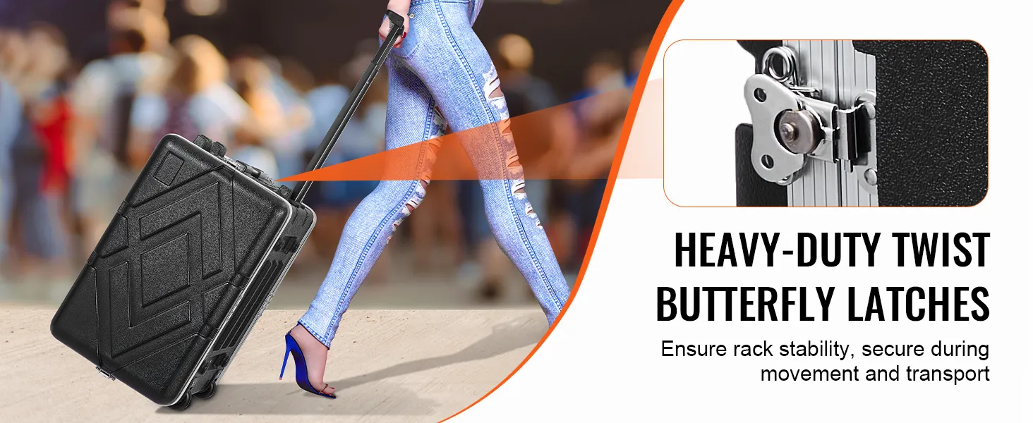 Gemakkelijk mee te nemen: de rackbehuizing met aluminium handgreep en wielen maakt het eenvoudig om uw apparatuur tussen locaties te vervoeren. Het is de ideale keuze voor professionals die waarde hechten aan efficiënt en probleemloos transport van in een rack gemonteerde apparatuur.