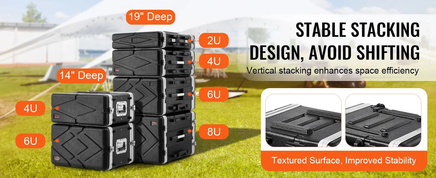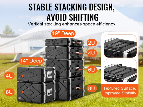 Met gemakkelijk toegankelijke verwijderbare panelen, veilige vlindersluitingen en stapelbare groeven en verkrijgbaar in meerdere maten (2U, 4U, 6U, 8U), is onze rackbehuizing ideaal voor het opslaan en transporteren van apparatuur.