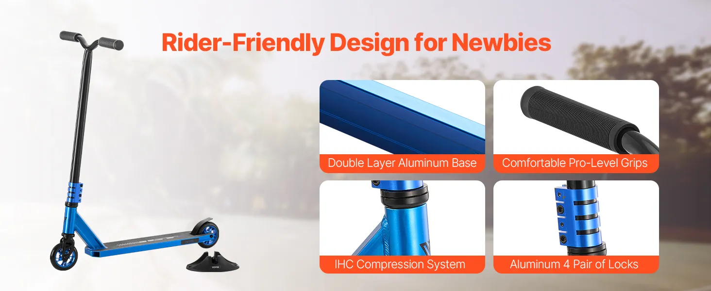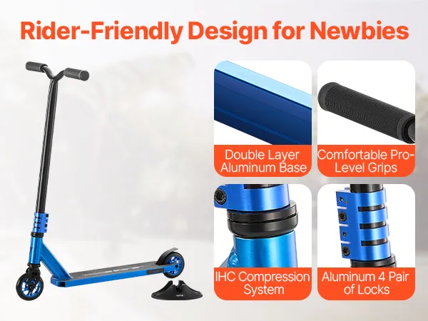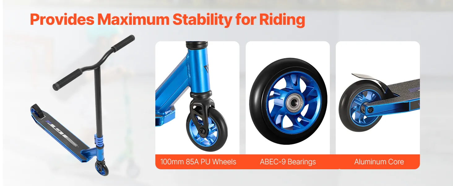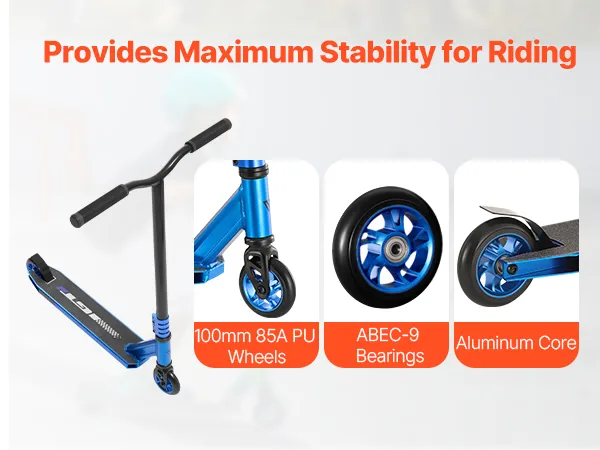 Smooth Ride: The freestyle scooters rider features a reinforced steel alloy threaded fork. It comes equipped with silent 100 mm PU wheels, providing a smooth riding experience. The newly upgraded ABEC-9 high-speed ball bearings ensure smooth performance at high speeds. This scooter is ready to take you anywhere, anytime