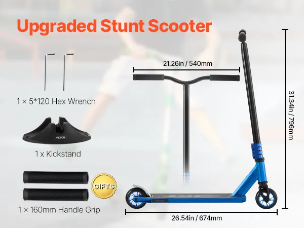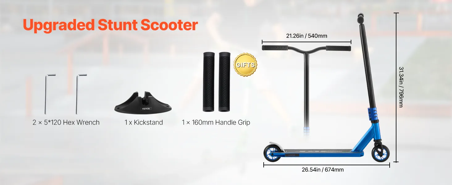 The trick scooter for teens comes with an integrated handlebar, deck, and hex wrenches for easy assembly. It also includes a kickstand for convenient parking and storage.