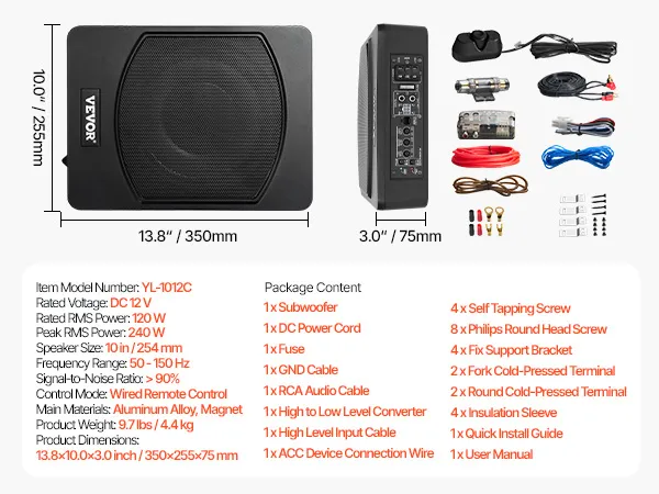 Meervoudige bescherming: deze actieve autosubwoofer is uitgerust met meerdere ingebouwde veiligheidsvoorzieningen, waaronder oververhitting, kortsluiting en zekeringbeveiliging, waardoor betrouwbare, langdurige prestaties worden gegarandeerd. En de behuizing van aluminiumlegering verbetert de warmteafvoer, voorkomt oververhitting en verlengt de levensduur van de subwoofer aanzienlijk