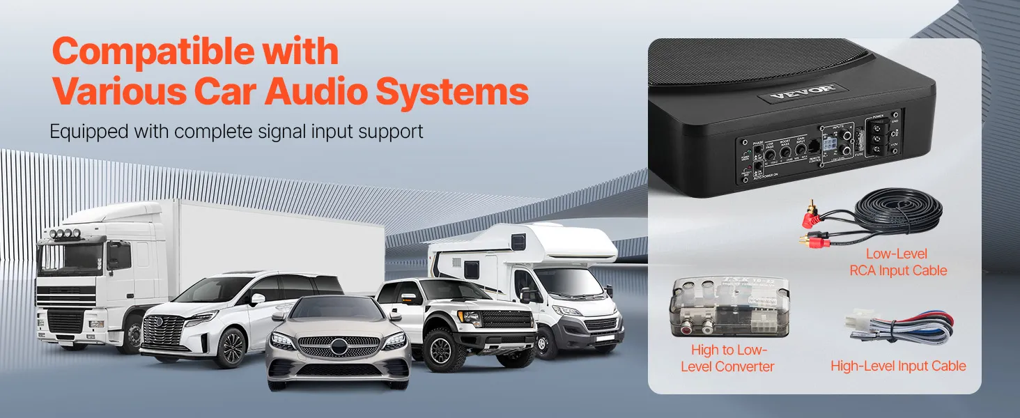 Deze subwoofer is compatibel met alle soorten voertuigen (auto's, SUV's, vrachtwagens en campers) en kan naadloos in uw audiosysteem worden geïntegreerd met behulp van de RCA-audiokabel of de high-level-ingangskabel. Het past perfect bij zowel hoogwaardige als vereenvoudigde hoofdunits.