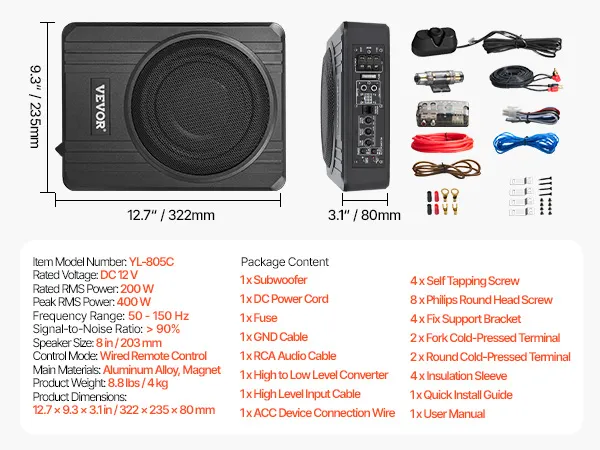 This 8" under-seat car subwoofer is a must-have for car audio enthusiasts, delivering powerful bass and clear sound while saving space with its slim 3.1" profile. Equipped with high/low level input and a maximum output of 400W, it greatly elevates your audio experience to next level.