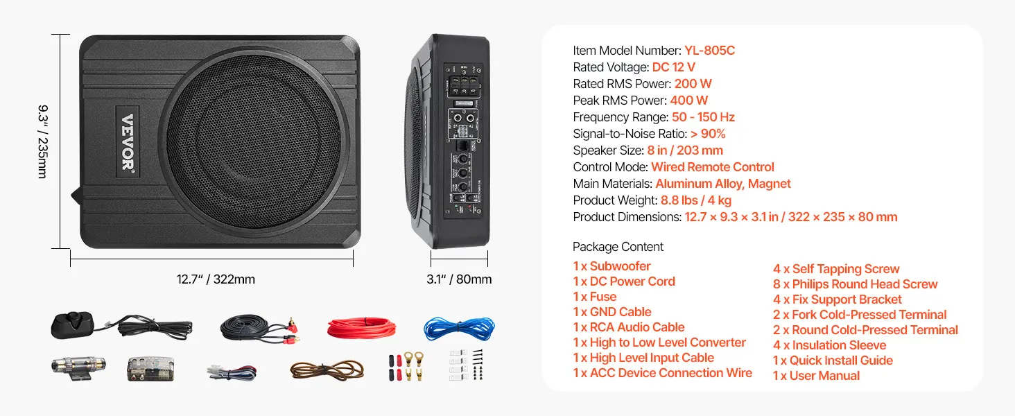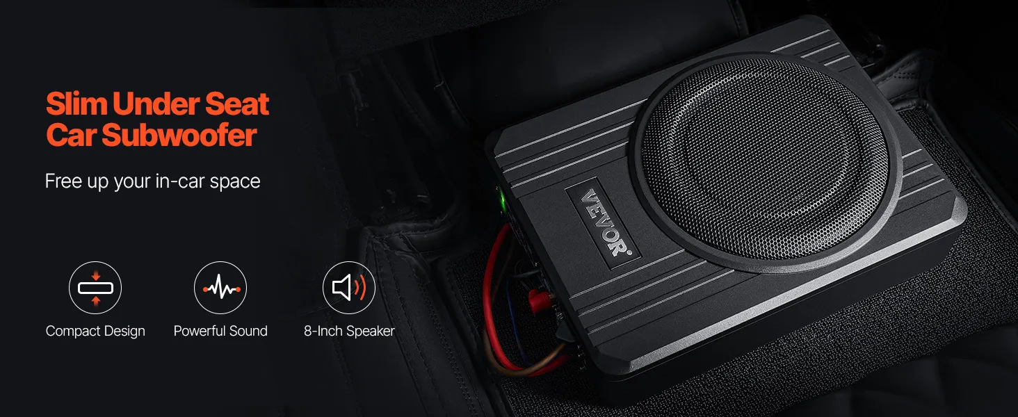 VEVOR 8" 400W Underseat Car Subwoofer, Slim Powered Car Subwoofers Under the Seat, Low Profile Audio Sub Built-in Amplifier, High/Low Level Input & Volume Controller for SUVs, Car, Truck, RV