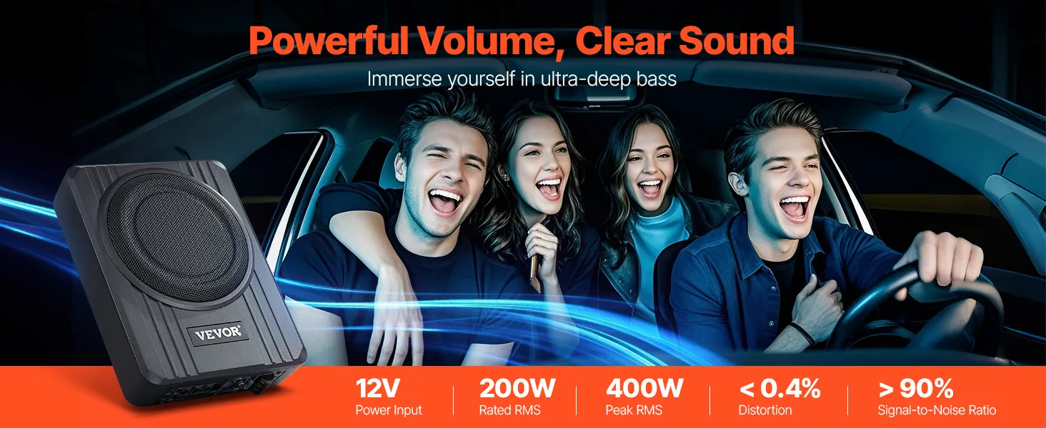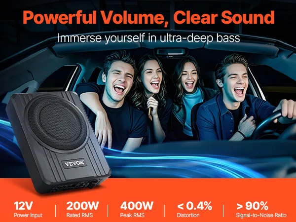 Stable with High Fidelity: With 200W RMS rated power and 400W RMS peak power, our 8" powered car audio subwoofer delivers a distortion rate below 0.4% and a signal-to-noise ratio greater than 90%. It maintains clear, accurate sound even at high volumes, minimizes background noise, and prevents speaker damage, creating an immersive audio experience.