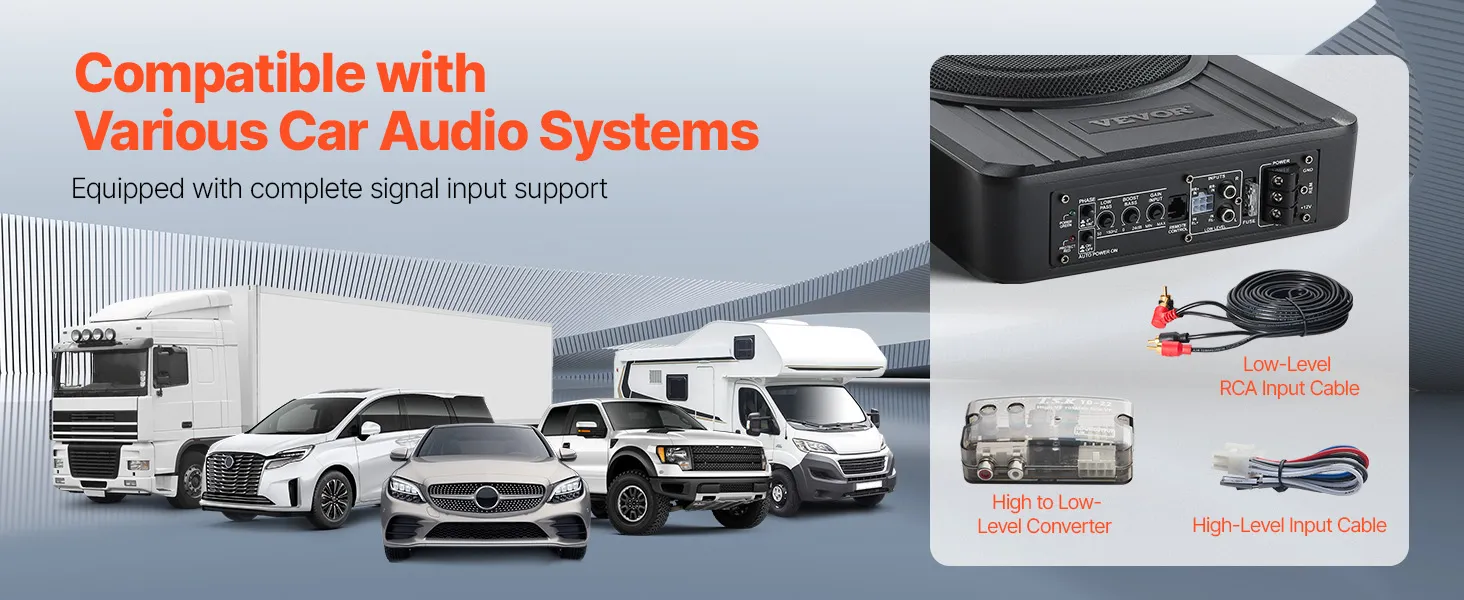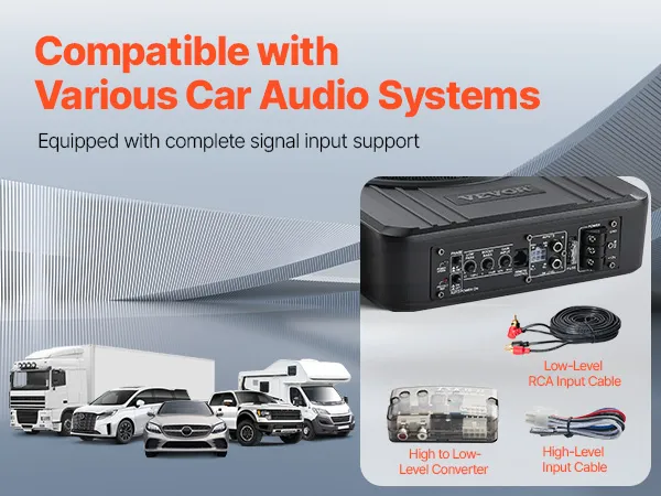 Compatible with all vehicle types—cars, SUVs, trucks, and RVs—this subwoofer seamlessly integrates with your audio system using the RCA audio cable or high-level input cable, offering impeccable matches with both high-end and simplified main units.