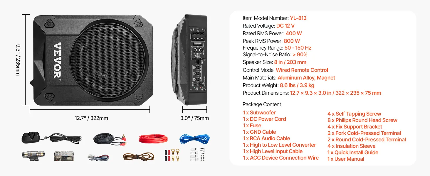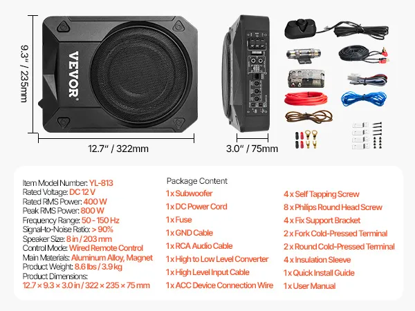 This 8" under-seat car subwoofer is a must-have for car audio enthusiasts, delivering powerful bass and clear sound while saving space with its slim 3.0" profile. Equipped with high/low level input and a maximum output of 800W, it greatly elevates your audio experience to next level.
